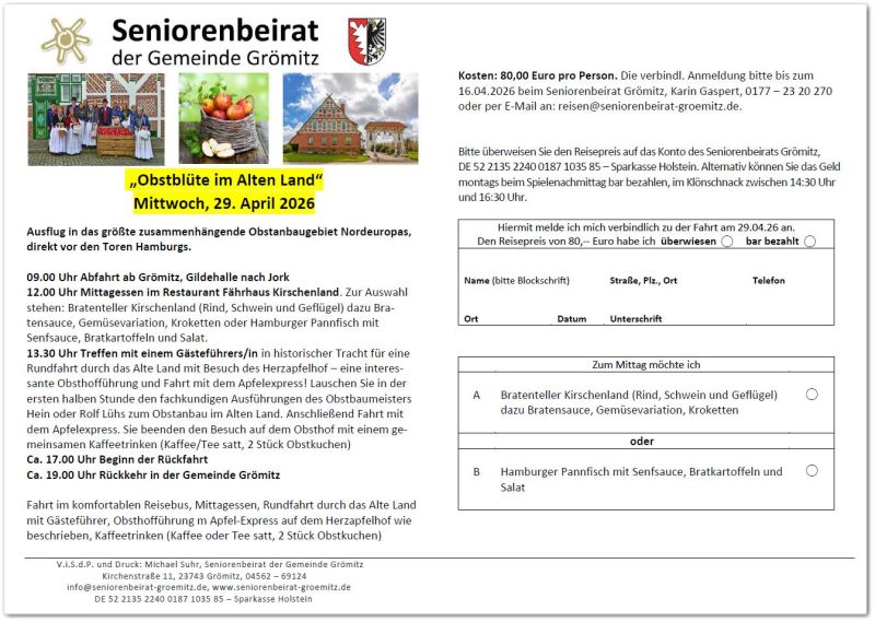 Kosten: 80,00 Euro pro Person. Die verbindl. Anmeldung bitte bis zum 16.04.2026 beim Seniorenbeirat Grömitz, Karin Gaspert, 0177 – 23 20 270 oder per E-Mail an: reisen@seniorenbeirat-groemitz.de.