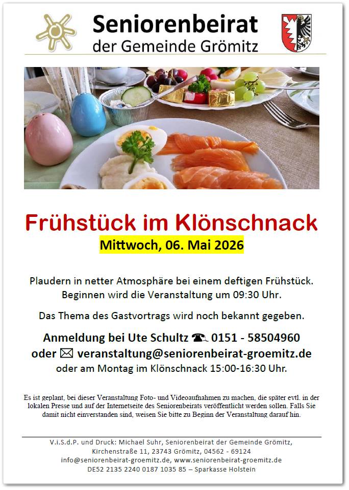 Endlich! Ja, es hat durch die Neuwahl des Seniorenbeirates diesmal ein wenig gedauert, aber nun ist es bald wieder soweit: Am Mittwoch, dem 06. Mai findet das erste vom neuen Beirat ausgerichtete Frühstück im Klönschnack statt. Grömitzer Seniorinnen und Senioren können an diesem Vormittag wieder bei einem deftigen Frühstück plaudern und sich auf einen sicherlich interessanten Gastvortrag freuen. Das Thema dieses Vortrages wird später noch bekannt gegeben. Eine Anmeldung ist wie immer erforderlich, damit wir wissen was eingekauft werden muss. Die Anmeldung kann bei Ute Schultz unter 0151 – 58504960, unter veranstaltung@seniorenbeirat-groemitz.de oder am Montag im Klönschnack beim Spielenachmittag erfolgen. Wir freuen uns auf viele Teilnehmende.