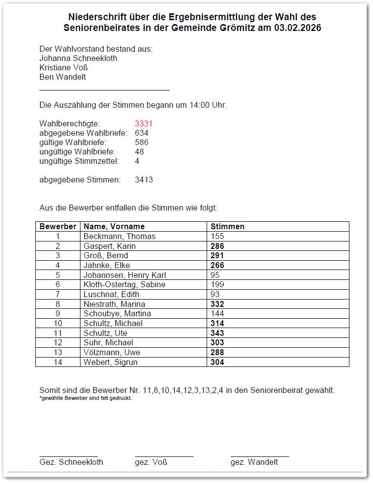 Es ist entschieden! Wenn denn alle Gewählten ihre Wahl annehmen, wird sich der kommende Seniorenbeirat der Gemeinde Grömitz für die Wahlperiode 2026-2029 aus folgenden Mitgliedern zusammensetzen (im Bild jeweils von links nach rechts):Â