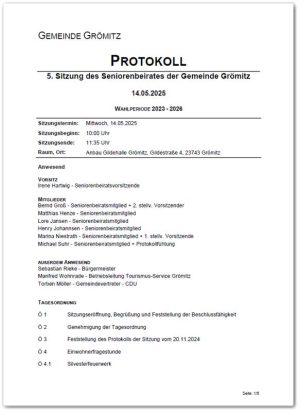 Protokolle Der Seniorenbeirat ist zu einer Sitzung einzuberufen, wenn es die Geschäftslage erfordert, mindestens jedoch einmal im Kalenderjahr (§ 7 Abs. I der Satzung). Unten finden Sie die Protokolle zu den Sitzungen. 14.05.25 20.11.24 20.11.24 - Anhang 22.05.2024 15.11.2023 09.03.2023 22.11.2022 02.11.2021